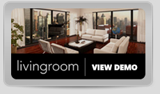 Apartment Living Room layout includes motorized shades, fully interactive television, lighting control, intercom, security and camera systems. The virtual environment operates just like a real automated system.